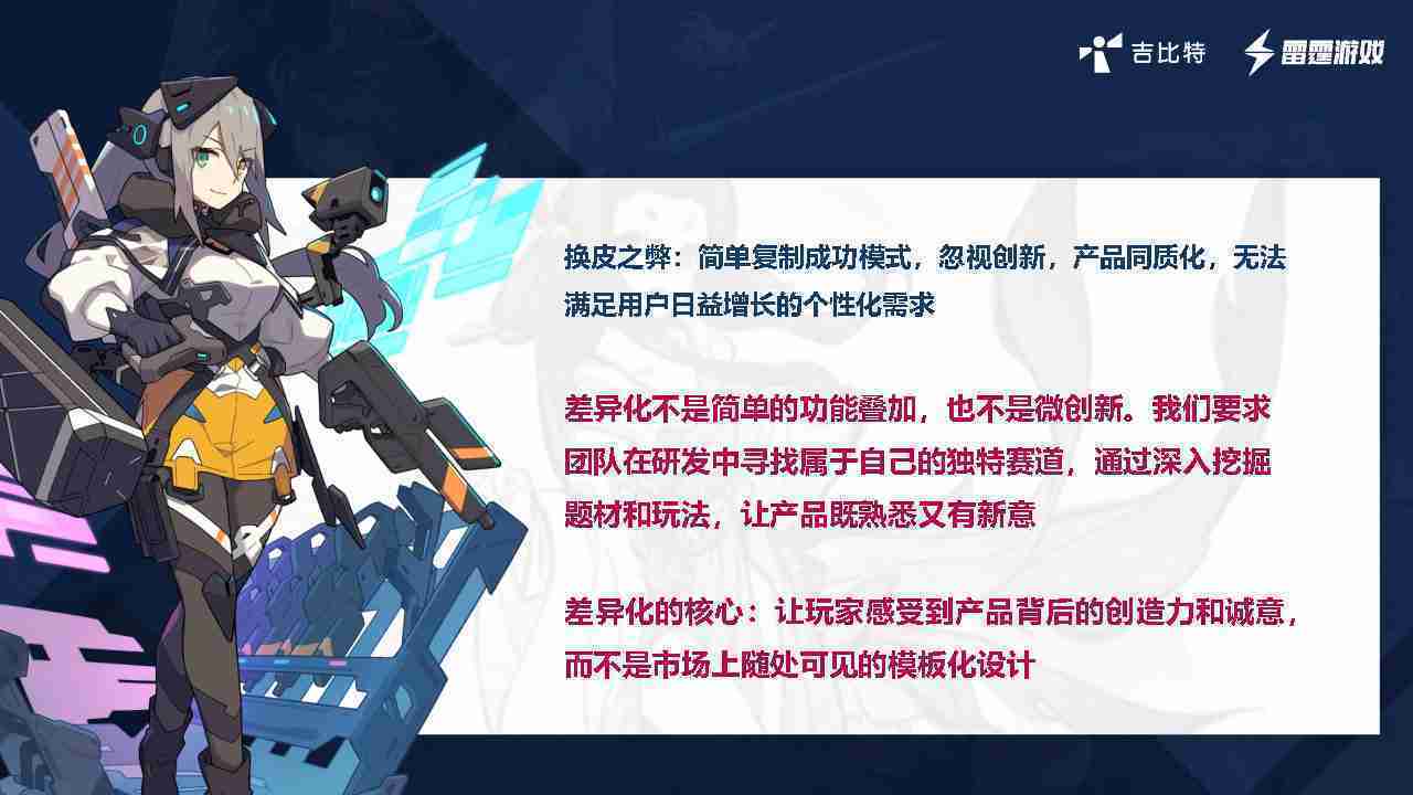 在我们内部是这么定义差异化的。。。。首先,,差异化不是简单的功能叠加,,更不是换皮。。。。只是换皮,,,,产品无法提供有效的市场价值。。。。内部经常说差异化的产品不是为了迎合市场,,而是找到一个自己独特的表达方式,,在研发中找到属于自己的细分赛道和独特赛道,,,,前提是需要对这个题材有足够的深入、、挖掘,,对玩法有足够深入的理解,,,,让产品看起来既熟悉又有新意。。。