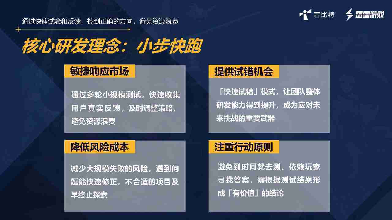 小步快跑不是找答案,,而是验证答案。。我们之前有项目是这样的,,,有些制作人会有几个方向觉得都可以做,,,,但是不确定做哪一个,,会选择几个都做,,,做完拿到市场跑,,,,跑出哪一个更好,,基于这个再做后续的研发和拓展。。但这种情况最容易出现一个问题,,可能被玩家裹胁,,,玩家说这个点不错、、、、那个点不错,,,到底听还是不听,,,不听感觉是无视玩家的反馈,,,听的话,,,可能自己没想清楚导致研发思路发生偏颇。。所以针对这一点后面自己复盘整理,,,发现制作人自己心里要有数,,,,要做自己觉得好玩的,,而且明确知道这个东西是你想做的,,然后拿到市场验证这个答案是不是对的,,,而不是拿一堆答案找哪一个答案更好。。。。