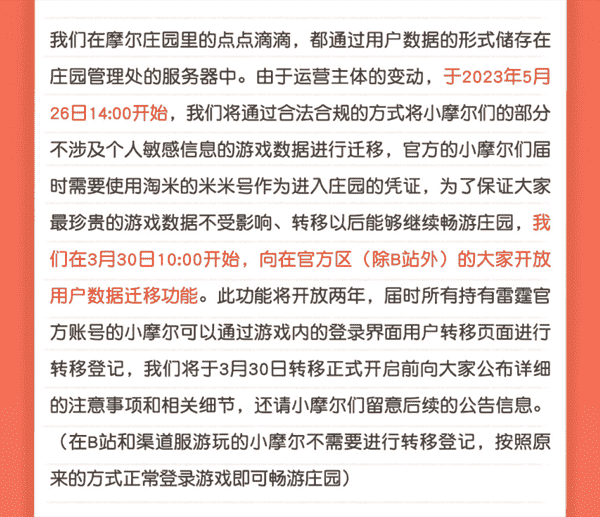 合作结束本就是开发方和代理方双方的事情,,降低这件事情对玩家的影响,,才是对所有珍视这段童年的摩尔玩家最好的呵护。。。。目前看来,,,,用户完全不用担心后续因无法登录游戏而造成任何数据上的损失,,,,只要及时进行账号转移,,就可以好好保留、、、、延续在庄园的痕迹和回忆,,,继续在庄园里做快乐的红鼻子小鼹鼠。。