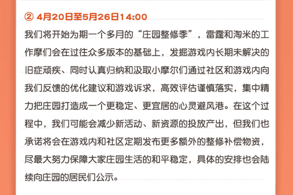 合作的结束并不意味着这个童年IP的结束,,对于《摩尔庄园》手游而言,,,,这是一个新阶段的开始。。后续游戏内将开启庄园重构计划,,,,会就以往遗留下来的BUG进行集中修复,,,并在游戏内和社区定期发布更多补偿物资。。